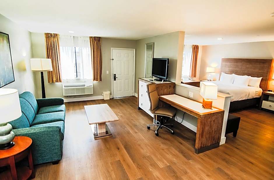 This king suite includes a sofa bed, microwave, and a small refrigerator. A TV with cable is also included for the guest's enjoyment.